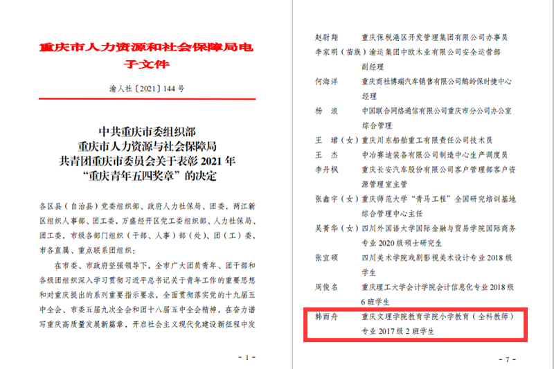 近日,中共重庆市委组织部、重庆市人力资源与社会保障局、共青团重庆市委员会下发了《关于表彰2021年“重庆青年五四奖章”和2020年度“重庆市优秀共青团员”“重庆市优秀共青团干部”“重庆市五四红旗团委(团支部)”的决定》,beat365学子韩雨舟荣获2020年度“重庆市优秀共青团员”称号。