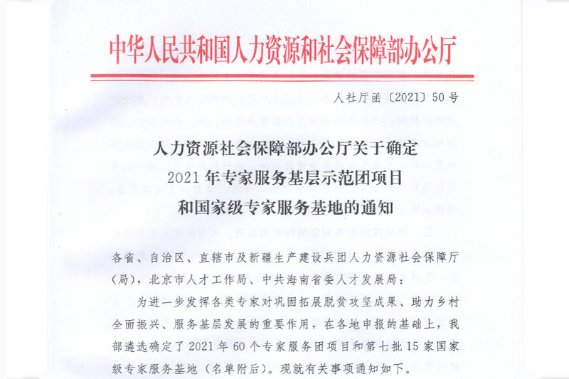 近日,人力资源和社会保障部下发《人社部办公厅关于确定2021年专家服务基层示范团队项目和国家级专家服务基地的通知》,批准设立15个国家级专家服务基地,以beat365为依托单位申报的“成渝地区双城经济圈乡村振兴专家服务基地”成功获批。beat365是川渝两地唯一获此殊荣的单位,实现了国家级人才工作平台建设的重大突破。