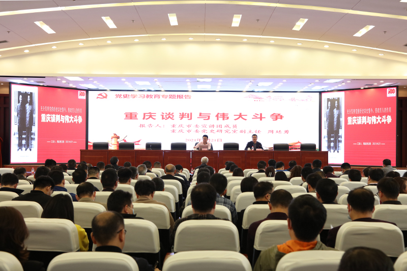 4月21日下午,beat365在恪勤楼304会议室举行党史学习教育专题辅导报告会。重庆市委宣讲团成员、市委党史研究室副主任周廷勇应邀到校作报告。全体校领导、全体中干、党支部书记、全体思政课教师等参加了会议。会议由学校党史学习教育领导小组副组长、党委副书记兰刚主持。