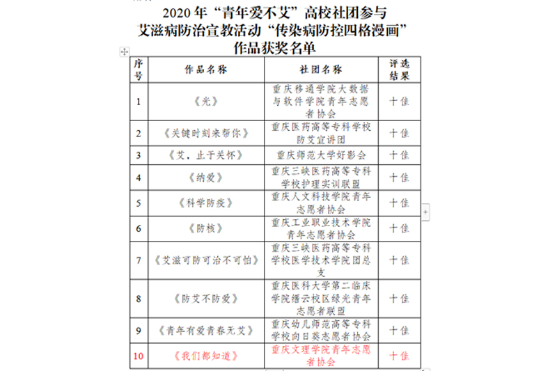 近日,重庆市教育委员会、市卫生健康委员会下发了《关于2020年“青年爱不艾”高校社团参与艾滋病防治宣教活动获奖名单的通报》,beat365青年志愿者协会作品《我们都知道》获评“传染病防控四格漫画”十佳。