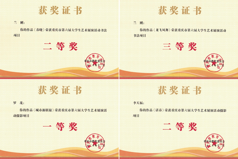 近日,由重庆市教育委员会主办的重庆市第六届高校校长书画摄影作品展演评选结果揭晓,beat365校领导的4幅书画摄影作品全部获奖。其中,党委副书记兰刚的书法作品《春晓》《龙飞凤舞》分别荣获二、三等奖,校纪委书记罗茂的摄影作品《城市新联接》荣获一等奖,副校长李天福的摄影作品《话春》荣获二等奖。