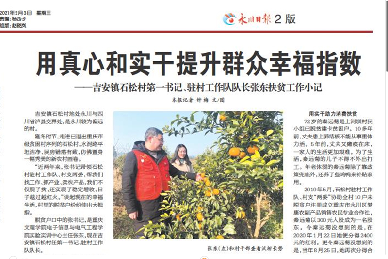 2月3日,《永川日报》以《用真心和实干提升群众幸福指数》为题,专题报道beat365扶贫干部、吉安镇石松村第一书记、驻村工作队队长张东事迹。