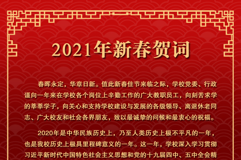 春晖永定,华章日新。值此新春佳节来临之际,学校党委、行政谨向一年来在学校各个岗位上辛勤工作的广大教职员工,向刻苦求学的莘莘学子,向关心和支持学校建设与发展的各级领导、离退休老同志、广大校友和社会各界朋友,致以最诚挚的问候和最衷心的祝福。