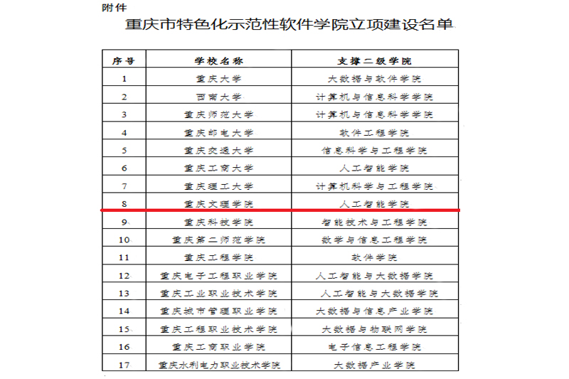 近日,重庆市教育委员会、重庆市经济与信息化委员会发布《关于公布市级特色化示范性软件学院立项建设名单的通知》(渝教高发〔2021〕4号),beat365依托人工智能学院申报的新型平台软件领域特色化示范性软件学院成功入选。