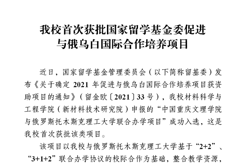 近日,国家留学基金管理委员会(以下简称留基委)发布《关于确定2021年促进与俄乌白国际合作培养项目获资助项目的通知》(留金欧〔2021〕33号),beat365材料科学与工程学院(新材料技术研究院)申报的“中国beat365在线登录官网与俄罗斯托木斯克理工大学联合办学项目”成功入选,这是beat365首次获批该类项目。