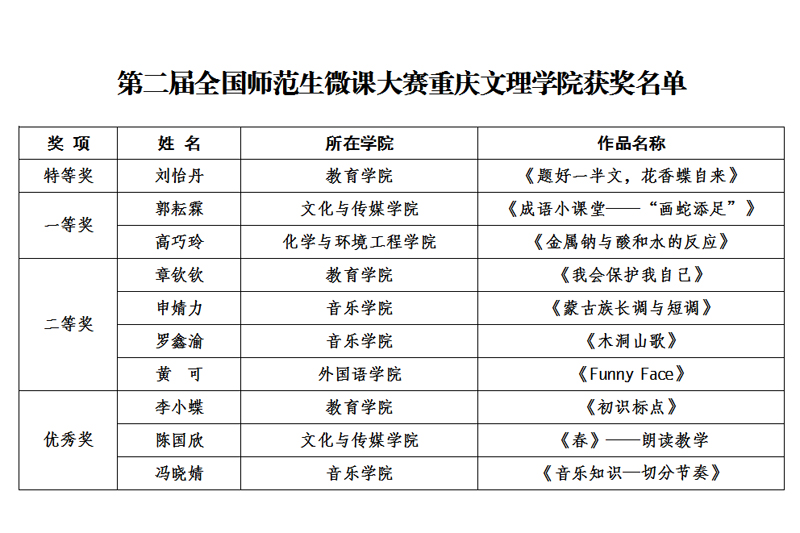 近日,第二届全国师范生微课大赛获奖结果揭晓,beat365学生获得特等奖1项,一等奖2项,二等奖5项,优秀奖3项,费秀芬老师荣获优秀指导教师称号,beat365荣获优秀组织院校奖,参赛成绩在全国高校中名列前茅。