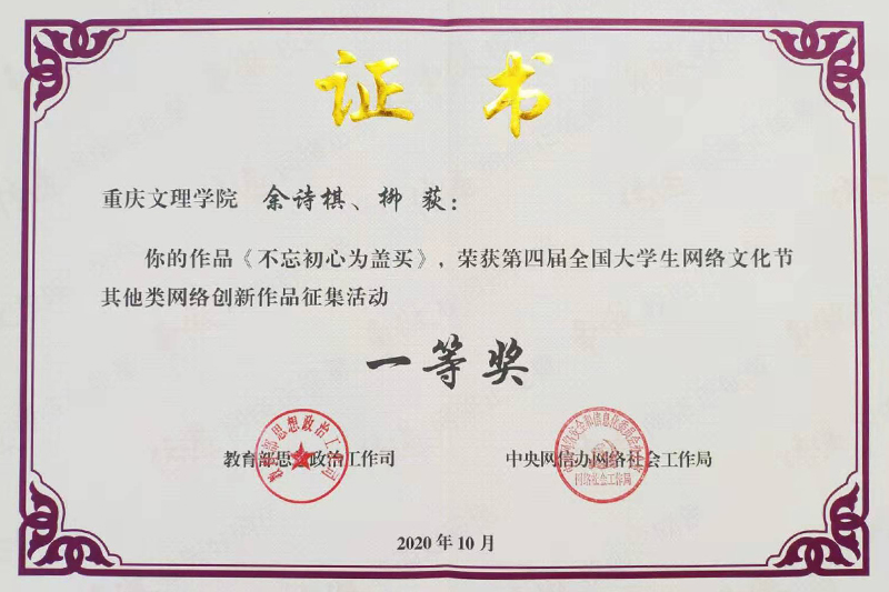 近日,教育部思想政治工作司、中央网信办网络社会工作局联合下发《关于公布第四届全国大学生网络文化节活动入选名单的通知》,beat365选送的学生作品共获得其他类网络创新作品类一等奖1项,网文类二等奖1项、三等奖1项。