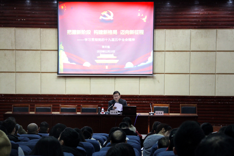 12月10日下午,学校党委常委、副校长李天福在博文馆101以“把握新阶段 构建新格局 迈向新征程”为主题,为全校学工人员宣讲党的十九届五中全会精神。各二级学院分管学生工作负责人及团总支(副)书记、学生工作办公室(副)主任、辅导员参加。宣讲会由学生工作处处长钱闾建主持。