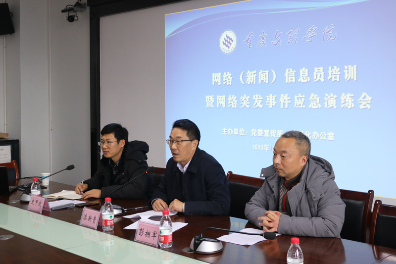 12月10日下午,学校在恪勤楼623会议室举行网络(新闻)信息员培训暨网络突发事件应急演练。学校副校长漆新贵,党委宣传部、信息化办公室有关负责人,应急办公室值班人员及全校网络(新闻)信息员参加。会议分为两个阶段进行。