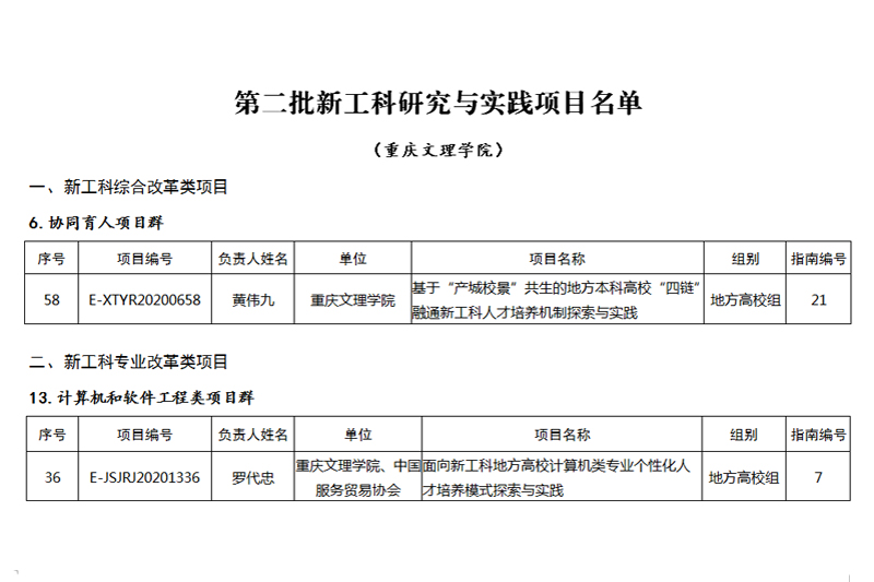 近日,教育部办公厅发布了《关于公布第二批新工科研究与实践项目的通知》(教高厅函〔2020〕23 号),在有关高校、省级教育行政管理部门和教育部教指委等方面择优推荐的基础上,经教育部专家综合评议及公示,共认定845个第二批新工科研究与实践项目。重庆市6所市属高校共获得10项,其中beat365获得2项,立项数量在重庆市属高校并列第一。这是beat365继首批获得两项国家级新工科研究与实践项目后,再次斩获两项。至此,beat365已获得国家级高等教育教学改革研究项目8项(国家级新工科研究与实践项目4项,国家级新农科研究与改革实践项目4项)。