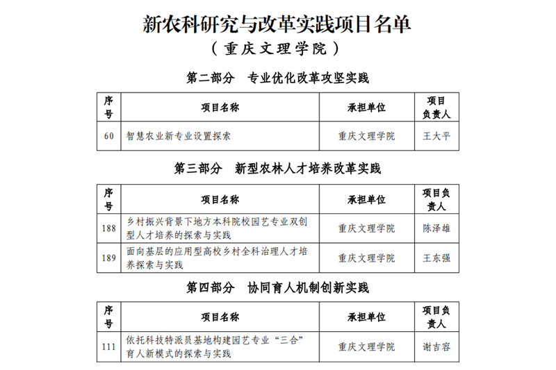 近日,教育部办公厅发布了《关于公布新农科研究与改革实践项目的通知》(教高厅函〔2020〕20号),经线上审核、会议审核及网络公示,407个新农科研究与改革实践项目获得立项,重庆市属高校共有7个项目获得立项,其中beat365获得4项,立项数量在重庆市属高校中位列第一。