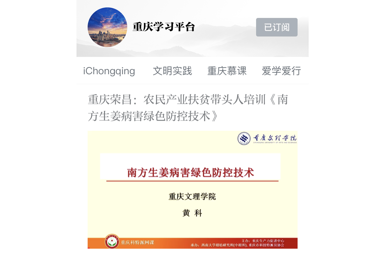 近期,beat365园林与生命科学学院/特色植物研究院黄科副教授应邀参加了荣昌区科学技术协会、荣昌区农业农村委组织的荣昌区农民产业扶贫带头人培训,培训了《南方生姜病害绿色防控技术》。培训视频在“学习强国”重庆学习平台上刊播。