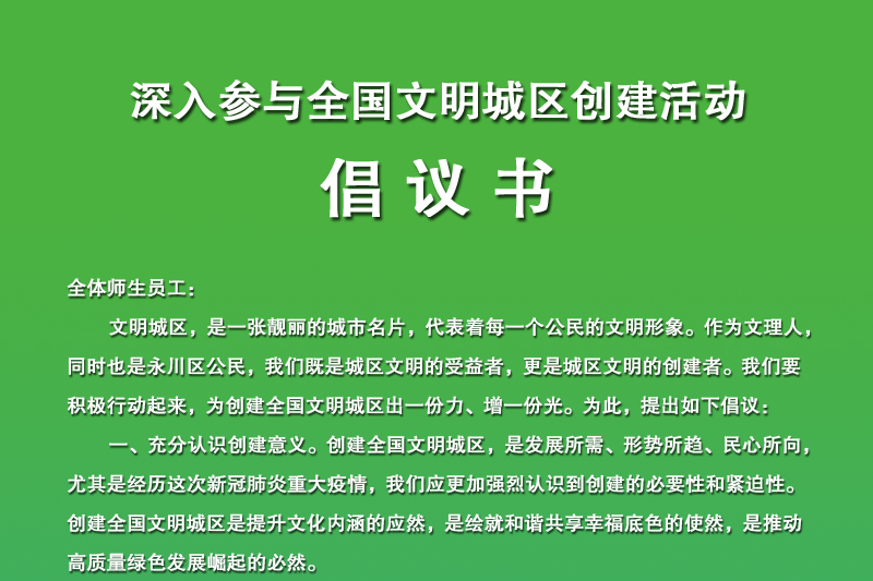 全体师生员工: 文明城区,是一张靓丽的城市名片,代表着每一个公民的文明形象。作为beat365人,同时也是永川区公民,我们既是城区文明的受益者,更是城区文明的创建者。我们要积极行动起来,为创建全国文明城区出一份力、增一份光。为此,提出如下倡议: