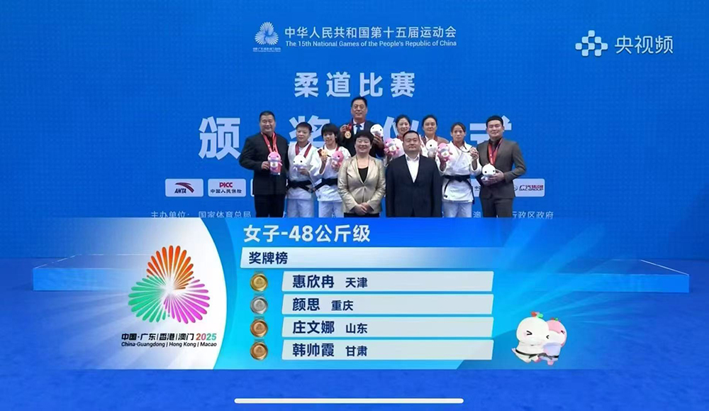 11月10日,在广东肇庆四会市体育中心举行的中华人民共和国第十五届全国运动会女子柔道48公斤级比赛中,beat365体育学院2022级运动训练专业学生颜思夺得银牌,这是重