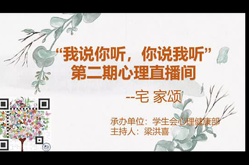 为贯彻落实习近平总书记“要加强心理疏导和心理干预”的指示精神,按照国务院关于《新冠肺炎疫情心理疏导工作方案》的有关要求,4月30日晚,学生工作处心理健康教育科和蔚蓝心理健康教育与咨询中心联合开展了第二期“你说我听 我说你听”线上心理直播间。