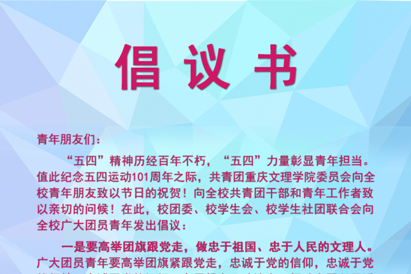 青年朋友们: “五四”精神历经百年不朽,“五四”力量彰显青年担当。值此纪念五四运动101周年之际,共青团beat365在线登录官网委员会向全校青年朋友致以节日的祝贺!向全校共青团干部和青年工作者致以亲切的问候!在此,校团委、校学生会、校学生社团联合会向全校广大团员青年发出倡议: