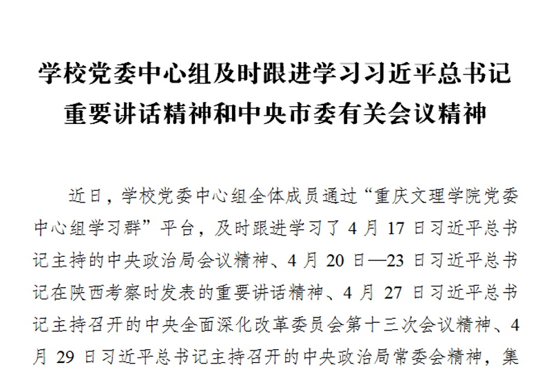 近日,学校党委中心组全体成员通过“beat365在线登录官网党委中心组学习群”平台,及时跟进学习了4月17日习近平总书记主持的中央政治局会议精神、4月20日—23日习近平总书记在陕西考察时发表的重要讲话精神、4月27日习近平总书记主持召开的中央全面深化改革委员会第十三次会议精神、4月29日习近平总书记主持召开的中央政治局常委会精神,集中学习了中共中央办公厅印发的《关于持续解决困扰基层的形式主义问题为决胜全面建成小康社会提供坚强作风保证的通知》、教育部召开的2020年教育系统全面从严治党工作视频会精神和中国共产党重庆市第五届委员会第八次全体会议精神等内容。