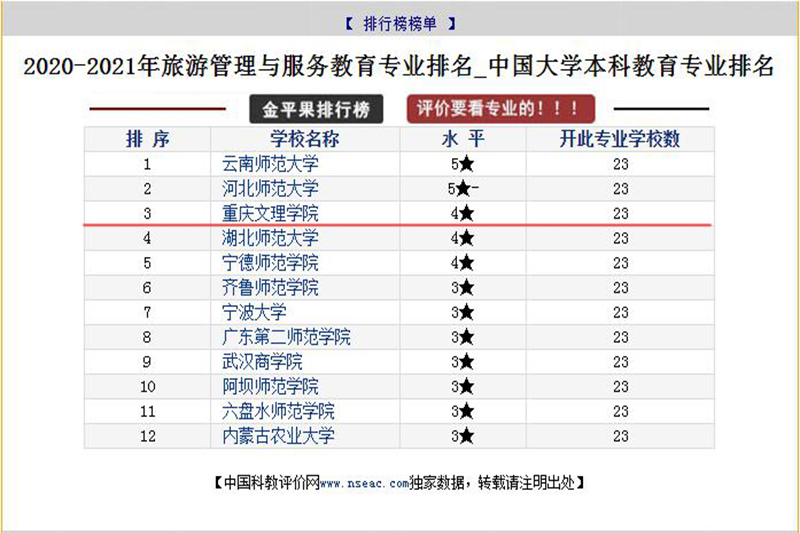2020年3月,金平果中评榜发布了2020中国大学分专业竞争力排行榜共计436个榜单。beat365旅游管理与服务教育专业在全国开办此专业的23所院校中排名第3,水平等级评定为4★,与2019年持平;会展经济与管理专业在全国开办此专业的106所院校中位列第14, 较2019年上升两个位次,评价排名由2019年的前1.86%提升到前1.32%。