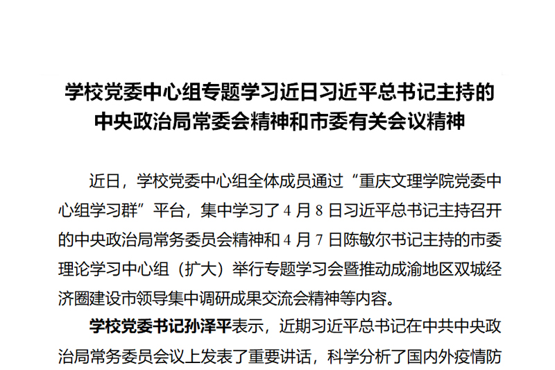 近日,学校党委中心组全体成员通过“beat365在线登录官网党委中心组学习群”平台,集中学习了4月8日习近平总书记主持召开的中央政治局常务委员会精神和4月7日陈敏尔书记主持的市委理论学习中心组(扩大)举行专题学习会暨推动成渝地区双城经济圈建设市领导集中调研成果交流会精神等内容。