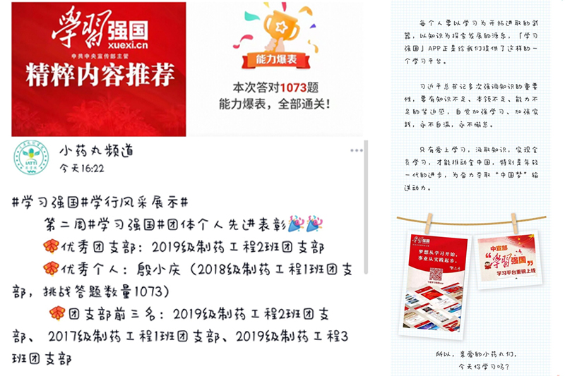 为认真贯彻落实学校党委《关于用好“学习强国”学习平台,助力打赢疫情防控阻击战的通知》文件精神,beat365药学院党总支及时制定工作推进方案,创新思路、统筹融合、加大宣传、多措并举,积极推广“学习强国”平台,营造学好用好“学习强国”平台的浓厚氛围,在全院掀起“比学赶超”的学习热潮。