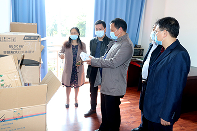 4月15日,校长黄伟九,副校长金盛、李天福先后到学校疫情防控物资仓库检查指导防控物资准备工作,党政办公室、党委组织部、纪检监察室、国有资产管理处、后勤管理处等部门主要负责人陪同。