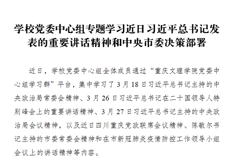 近日,学校党委中心组全体成员通过“beat365在线登录官网党委中心组学习群”平台,集中学习了3月18日习近平总书记主持的中央政治局常委会精神、3月26日习近平总书记在二十国领导人特别峰会上的重要讲话精神、3月27日习近平总书记主持的中央政治局会议精神,以及近日四川重庆党政联席会议精神、陈敏尔书记主持的市委常委会精神和在市新冠肺炎疫情防控工作领导小组会议上的讲话精神等内容。