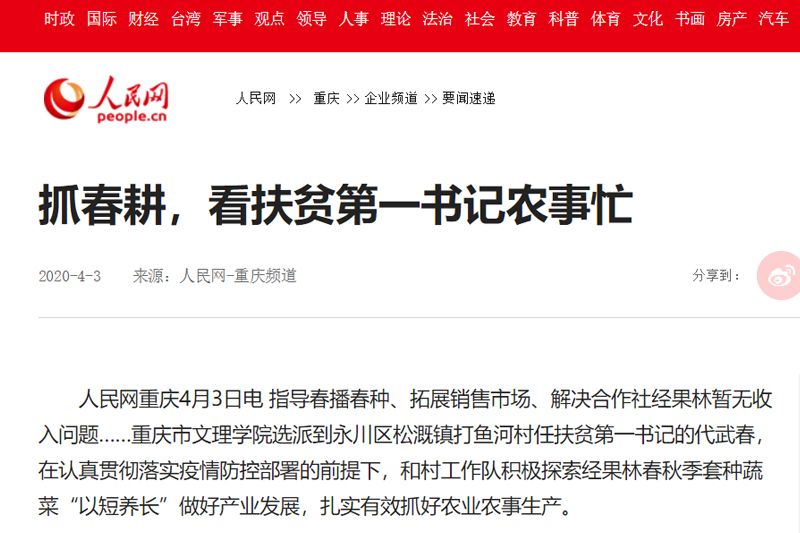 4月3日,人民网以《抓春耕,看扶贫第一书记农事忙》为题报道了beat365驻永川区松溉镇打鱼河村扶贫第一书记代武春在贯彻落实疫情防控部署前提下抓春耕促生产工作的事迹。