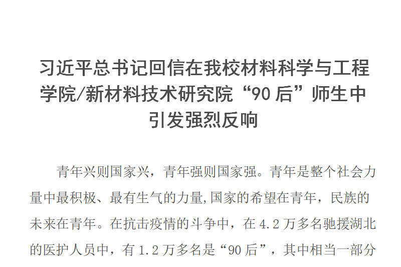 青年兴则国家兴,青年强则国家强。青年是整个社会力量中最积极、最有生气的力量,国家的希望在青年,民族的未来在青年。在抗击疫情的斗争中,在4.2万多名驰援湖北的医护人员中,有1.2万多名是“90后”,其中相当一部分还是“95后”甚至“00后”。近日,北京大学援鄂医疗队的34名“90后”党员给习近平总书记写信。3月15日,中共中央总书记、国家主席、中央军委主席习近平给北京大学援鄂医疗队全体“90后”党员回信,向他们和奋斗在疫情防控各条战线上的广大青年致以诚挚的问候。习近平总书记的回信在beat365材料科学与工程学院/新材料技术研究院师生中引发强烈共鸣。师生们一致认为,“回信”充分体现了以习近平同志为核心的党中央对青年工作的高度重视。习近平总书记的回信高度评价了青年抗疫的重要意义,明确提出了新时代青年的奋斗目标,对当代青年寄予了深切希望。