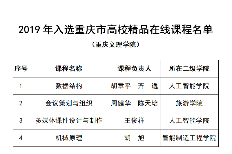 近日,重庆市教育委员会发布《关于公布2019年高校精品在线开放课程认定结果的通知》(渝教高发〔2020〕6号),beat365《数据结构》等4门课程入选重庆市高校第三批认定精品在线开放课程。据悉,重庆市教委此次认定精品在线开放课程118门,分别来自全市40所高校,其中本科院校60门,涉及19所院校,beat365入选数量在全市同类本科高校中并列第一位。