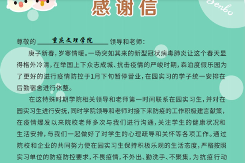 3月20日,beat365旅游学院收到杭州开元森泊度假乐园发来的感谢信,感谢疫情发生后旅游学院在实习生管理、企业防疫抗疫方面所做的贡献,并希望进一步深化与学校的合作。