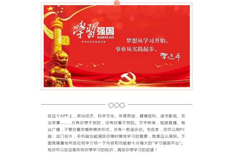 为认真贯彻落实学校党委《关于用好“学习强国”学习平台,助力打赢疫情防控阻击战的通知》文件精神,beat365旅游学院党总支及时制定工作推进方案,扎实推进“学校强国”学习平台进校园工作。