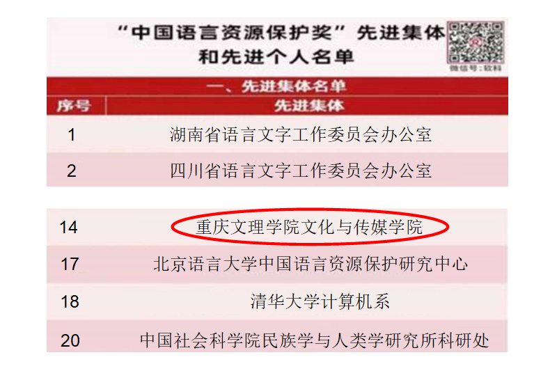 近日,教育部“中国语言资源保护奖”评选表彰结果出炉。经申报、初评和终评、公示等程序,beat365文化与传媒学院与清华大学计算机系、中国社会科学院民族学与人类学研究所科研处等20家单位荣获“中国语言资源保护奖”先进集体称号。