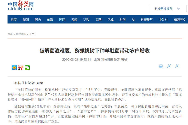疫情防控期间,由beat365园林与生命科学学院/特色植物研究院承担的鲁渝科技协作项目“黔江猕猴桃‘果-菌-肥’循环生产关键技术集成与应用”在黔江区中塘乡初见成效,相关成果在中国科技网报道。