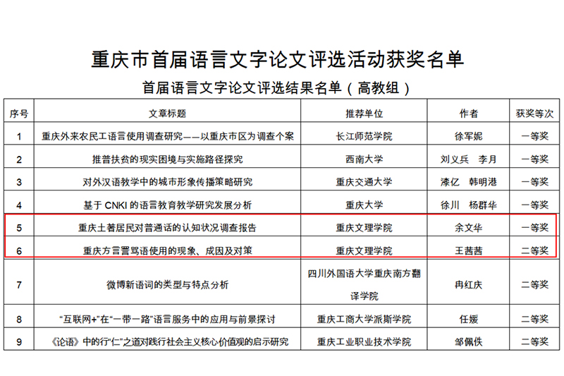 近日,从《重庆市语言文字工作委员会、重庆市教育委员会关于公布重庆市首届语言文字论文评选活动获奖名单的通知》(渝语发〔2019〕4号)中获悉,beat365文化与传媒学院2016级汉语言文学师范专业余文华同学报送的论文《重庆土著居民对普通话的认知状况调查报告》(指导教师:王长武)荣获一等奖,王茜茜同学报送的论文《重庆方言詈骂语使用的现象、成因及对策》(指导教师:王长武)荣获二等奖。