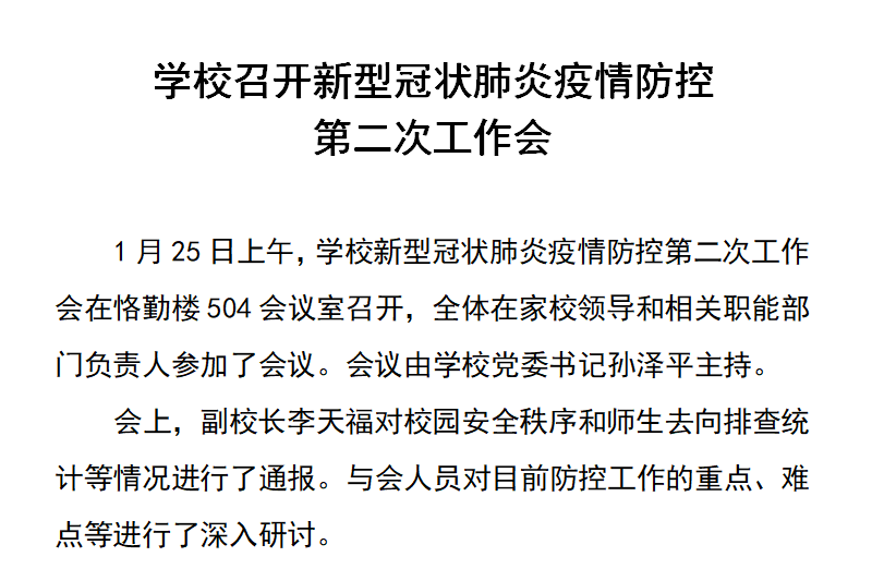 1月25日上午,学校新型冠状肺炎疫情防控第二次工作会在恪勤楼504会议室召开,全体在家校领导和相关职能部门负责人参加了会议。会议由学校党委书记孙泽平主持。