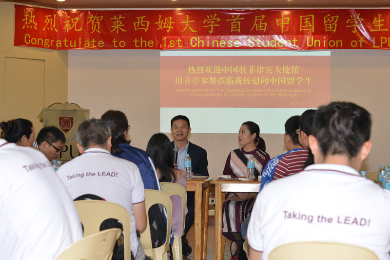 12月17日,中国驻菲律宾大使馆参赞田善亭莅临菲律宾莱西姆大学,关心慰问中国留学生并出席莱西姆大学中国留学生会成立大会。