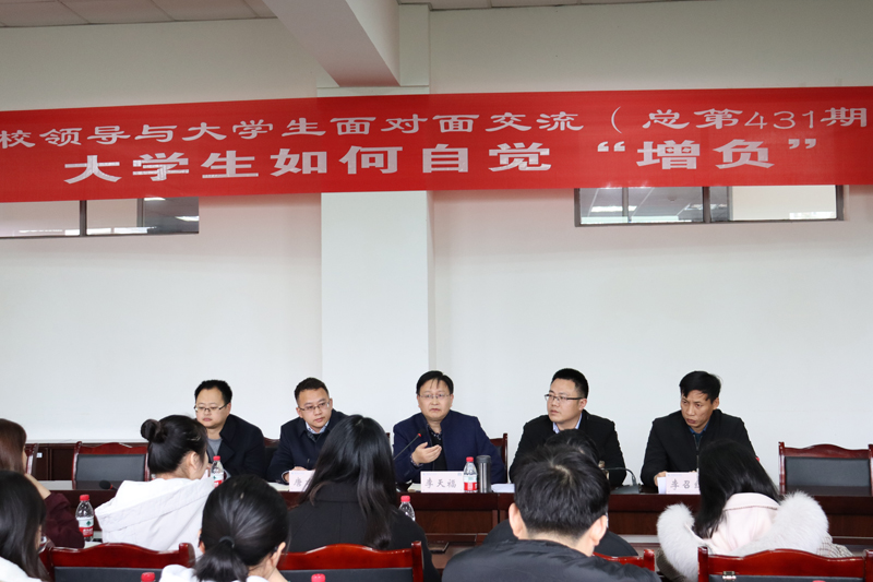 11月18日下午,学校第431期“校领导与大学生面对面交流”活动在红河校区学生事务中心303会议室举行。本次交流的主题是“大学生如何自觉‘增负’”。活动由副校长李天福主持,学生处、教务处、科研处、团委相关负责人及部分大学生代表共50余人参加交流活动。