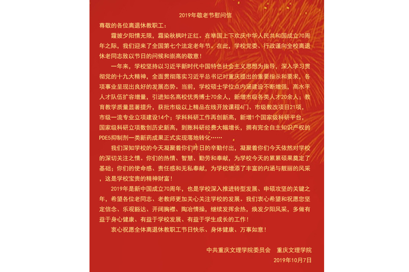 尊敬的各位离退休教职工: 霞披夕阳情无限,霜染秋枫叶正红。在举国上下欢庆中华人民共和国成立70周年之际,我们迎来了全国第七个法定老年节。在此,学校党委、行政谨向全校离退休老同志致以节日的问候和崇高的敬意!
