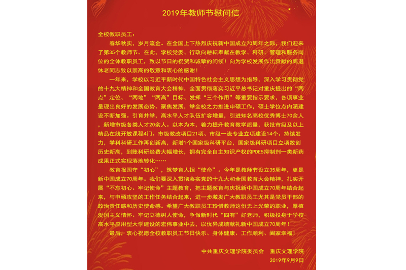 全校教职员工: 春华秋实,岁月流金。在全国上下热烈庆祝新中国成立70周年之际,我们迎来了第35个教师节。在此,学校党委、行政向耕耘奉献在教学、科研、管理和服务岗位的全体教职员工,致以节日的祝贺和诚挚的问候!向为学校发展作出贡献的离退休老同志致以崇高的敬意和衷心的感谢!