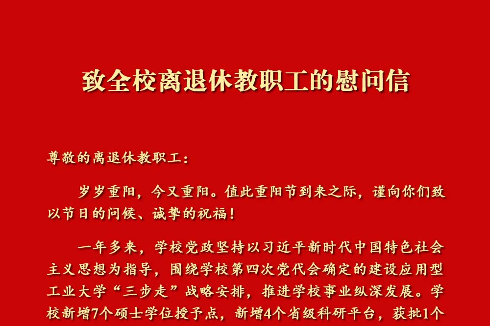 尊敬的离退休教职工: 岁岁重阳,今又重阳。值此重阳节到来之际,谨向你们致以节日的问候、诚挚的祝福! 一年多来,学校党政坚持以习近平新时代中国特色社会主义思想为指导,围绕学校第四次党代会确定的建设应用型工业大学“三步走”战略安排,推进学校事业纵深发展。学校新增7个硕士学位授予点,新增4个省级科研平台,获批1个重庆市普通本科高校产教融合特色优势专业群、2项“本科教学成果培育揭榜挂帅”专项项目,首次获得教育部高等学校科学研究优秀成果奖二等奖,7名学者入选全球前2%顶尖科学家;新生一本线上录取占51.5%,2024届毕业生初次去向落实率达到89.7%;学生社区治理工作受到主流媒体广泛报道,赢得社会高度评价;荣获“重庆市乡村振兴贡献奖先进集体”称号,老教师合唱团在重庆首届中老年合唱展演中斩获四大奖项。市委书记袁家军深入学校调研,对学校的办学成绩和发展方向给予充分肯定。 缘木思本,饮水思源。在过去的岁月里,你们以无私奉献和辛勤耕耘为教育事业躬耕奉献,为学校的建设与发展奠定了坚实的基础。如今,你们虽已离开工作岗位,但仍心系学校发展、关心学生成长,积极为学校的改革与发展建言献策。你们的付出与贡献,将永远镌刻在学校事业发展的丰碑上。 莫道桑榆晚,为霞尚满天。我们真切期望你们继续关心支持学校工作,为建设应用型工业大学贡献智慧和力量。 祝愿全校离退休教职工身体健康、心情舒畅! 中共beat365在线登录官网委员会 beat365在线登录官网 2024年10月11日
