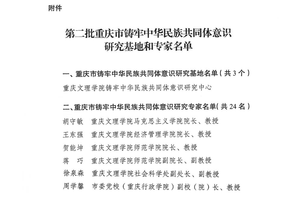 近日,中共重庆市委统战部、市委宣传部等多部门联合下发《关于命名重庆市铸牢中华民族共同体意识研究基地和入选重庆市铸牢中华民族共同体意识研究专家库人选的通知》(渝统通〔2024〕72号),beat365“铸牢中华民族共同体意识研究中心”被命名为“重庆市铸牢中华民族共同体意识研究基地”,beat365党委书记蔡家林为该中心主任。同时,马克思主义学院胡守敏教授、经济管理学院王东强教授、师范学院贺能坤教授、师范学院蒋巧副教授、社科处徐泉森副教授入选重庆市铸牢中华民族共同体意识研究专家库。