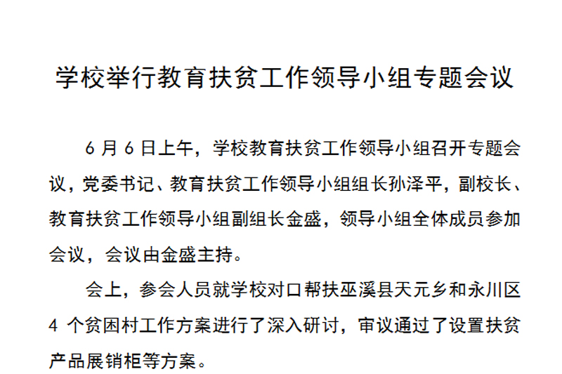 6月6日上午,学校教育扶贫工作领导小组召开专题会议,党委书记、教育扶贫工作领导小组组长孙泽平,副校长、教育扶贫工作领导小组副组长金盛,领导小组全体成员参加会议,会议由金盛主持。