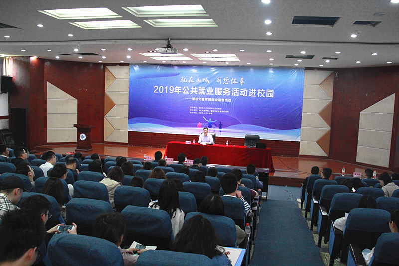 为落实党中央、国务院大力推进高校毕业生充分就业的工作部署,5月30日下午,由重庆市人力资源和社会保障局主办,beat365在线登录官网、重庆市就业服务管理局承办,重庆市人才大市场协办的“就在山城•渝您位来”2019年公共就业服务活动进校园活动在博文馆101举行。重庆市就业服务管理局副局长石屹,重庆市人才大市场、永川区就业局、相关企业及学校学工部负责人,各二级学院辅导员及学生代表200余人参加此次活动。活动由学工部部长何独明主持。