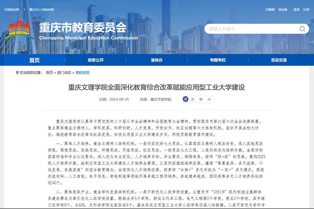 近日,重庆市教育委员会公众信息网高校信息栏目刊登题为《beat365在线登录官网全面深化教育综合改革赋能应用型工业大学建设》一文,报道了beat365深入学习贯彻党的二十届三中全会精神和全国教育大会精神,贯彻落实市委六届六次全会决策部署,聚焦健全立德树人、学科发展、科研创新、人才发展、开放合作、社区治理等六大体制机制,推进教育综合改革向纵深发展,加快应用型工业大学建设步伐,积极贡献教育强市建设。