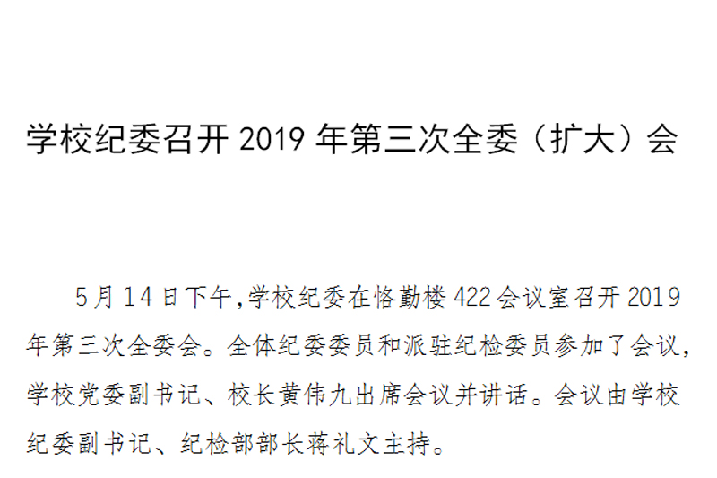 5月14日下午,学校纪委在恪勤楼422会议室召开2019年第三次全委会。全体纪委委员和派驻纪检委员参加了会议,学校党委副书记、校长黄伟九出席会议并讲话。会议由学校纪委副书记、纪检部部长蒋礼文主持。