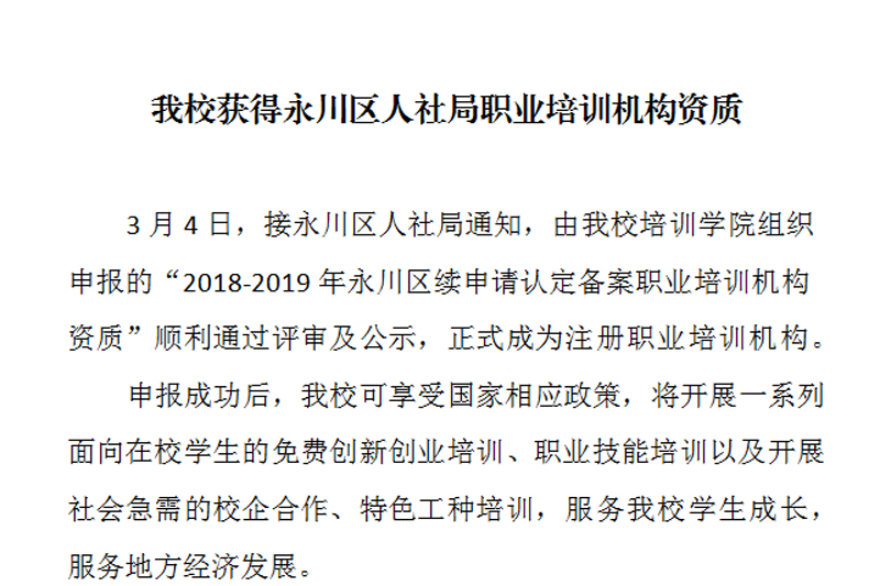 3月4日,接永川区人社局通知,由beat365培训学院组织申报的“2018-2019年永川区续申请认定备案职业培训机构资质”顺利通过评审及公示,正式成为注册职业培训机构。