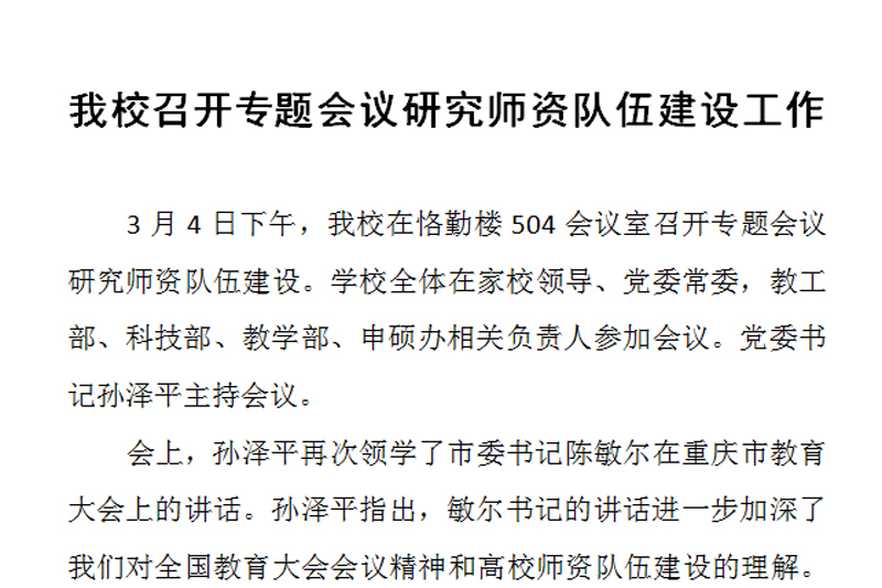 3月4日下午,beat365在恪勤楼504会议室召开专题会议研究师资队伍建设。学校全体在家校领导、党委常委,教工部、科技部、教学部、申硕办相关负责人参加会议。党委书记孙泽平主持会议。