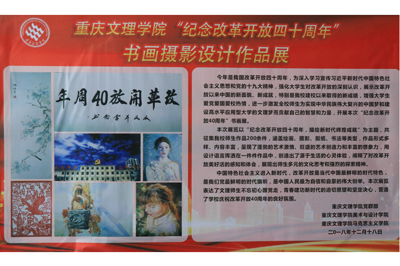 为纪念改革开放四十周年,展示改革开放以来中国的新面貌、新成就,特别是beat365升本建院以来取得的新成绩,12月18日-21日,beat365在红河A区逸夫楼一楼展厅组织开展了以“纪念改革开放四十周年”主题书画展。