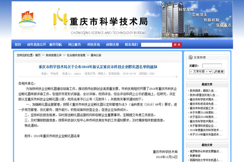 12月24日,重庆市科学技术局发文公布了2018年新认定重庆市科技企业孵化器名单,beat365地恩科技孵化器被认定为重庆市科技企业孵化器。