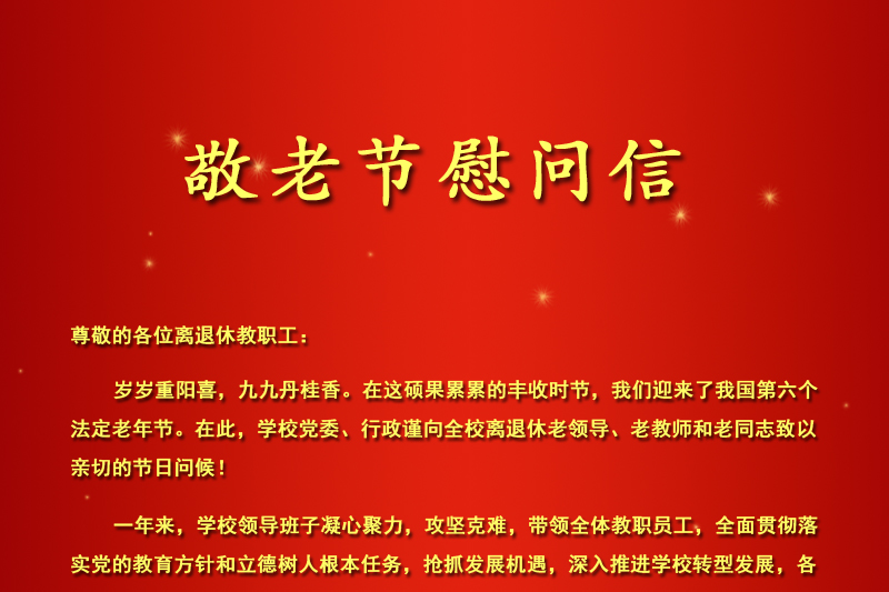 尊敬的各位离退休教职工: 岁岁重阳喜,九九丹桂香。在这硕果累累的丰收时节,我们迎来了我国第六个法定老年节。在此,学校党委、行政谨向全校离退休老领导、老教师和老同志致以亲切的节日问候!